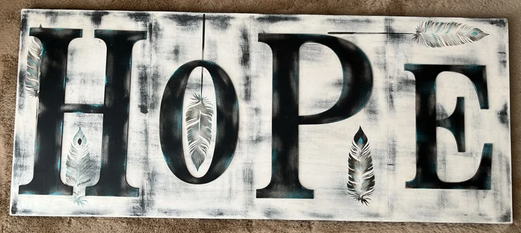 Obra moderna que combina tipografía y plumas en una paleta sobria de blancos y negros con sutiles detalles azulados. Transmite calma, fuerza y un mensaje de esperanza, ideal para espacios contemporáneos.